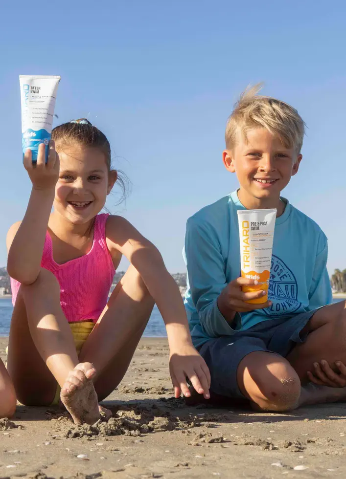 Дитячий набір від Trihard для здорової шкіри та волосся без хлору. Три засоби забезпечують повний захист від хлору та солоної води, зменшуючи поглинання та видаляючи їх зі шкіри та волосся, одночасно забезпечуючи зволоження та відновлення. Він також знімає свербіж шкіри та голови та є найкращим набором для маленьких плавців.